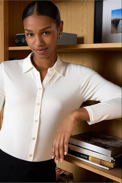 Camisa de manga larga confeccionada en viscosa de bambú, con un diseño básico y atemporal que se adapta a cualquier estilo. Su tejido es extremadamente suave y elástico, ofreciendo una sensación de segunda piel con un ajuste cómodo y natural. Biodegradable y organica.