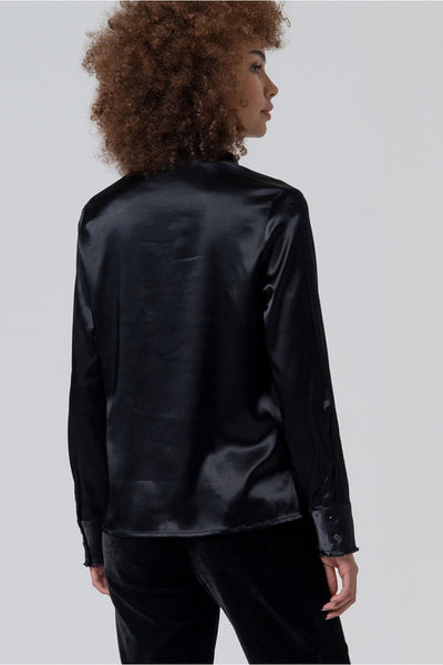 Camisa de tejido satinado con brillo sutil y tacto suave, confeccionada en rayón y viscosa elástica para garantizar comodidad. El cuello y los puños rematados con volantes añaden un toque femenino y delicado. Una prenda que une elegancia y originalidad.
