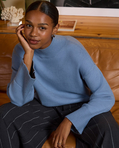 Jersey de punto elástico y muy suave con cuello perkins y manga larga acampanada. Un básico diferente con carácter, perfecto para el día a día, con un fit relajado y favorecedor.