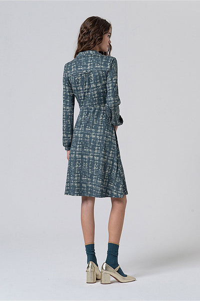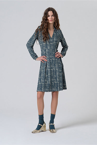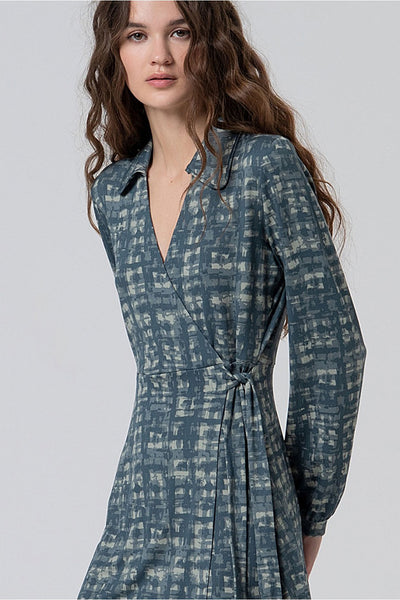 Vestido cruzado de viscosa reciclada que combina el confort del tejido elástico con un diseño favorecedor gracias al nudo en la cintura. El estampado gráfico y el escote pico aportan un aire moderno y fluido. Una opción muy versátil para cualquier ocasión.