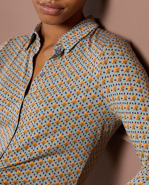 Camisa de manga larga confeccionada en viscosa suave y elástica, con un encantador micro estampado de aire retro. Su corte clásico con cuello camisero la convierte en una prenda versátil, cómoda y con mucho estilo, ideal para el día a día. Biodegradable y organico.