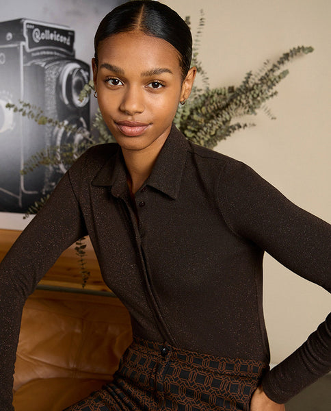 Camisa clásica elaborada en tejido lurex negro combina elasticidad y un sutil brillo metálico, ofreciendo un ajuste cómodo y elegante. Su diseño atemporal la hace ideal para ocasiones formales o para aportar un toque sofisticado a atuendos casuales. La elasticidad del tejido garantiza libertad de movimiento sin perder la estructura, realzando la figura con comodidad. Perfecta para quienes buscan una prenda versátil que une estilo y funcionalidad.