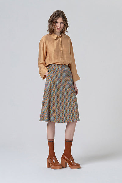 Falda a la rodilla con silueta evasé, sin cierres para una mayor comodidad. Está confeccionada en una viscosa suave y elástica con un pequeño estampado geométrico de aire retro que la convierte en una prenda muy femenina. Biodegradable y organico.