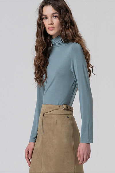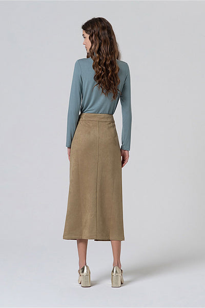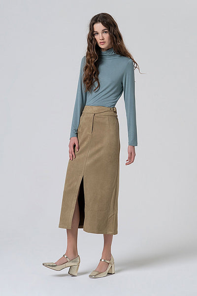 Falda recta midi con abertura y detalle de falso cinturón. Cierre frontal con hebilla invisible y cremallera. Confeccionada en un tejido técnico de poliéster con acabado aterciopelado y elástico.