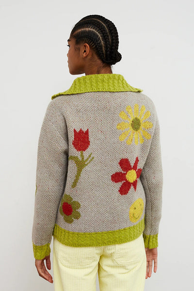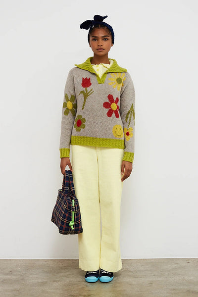 Jersey gris con jacquard de maxi flores en tonos amarillo, verde y rojo. Cuello marinero, corte recto y manga larga. Detalle de acabados en punto trenzado en puños, bajo y cuello. Tejido gustoso y esponjoso en mezcla de lana.