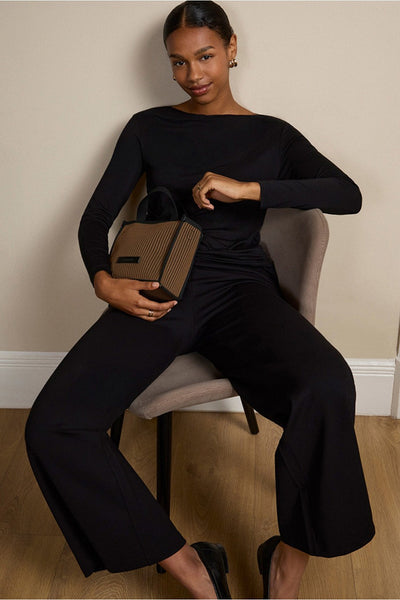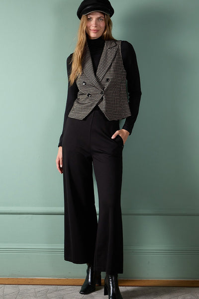 Pantalón de pierna ancha, sin cierres y con bolsillos laterales. Su tejido elástico y cómodo lo convierte en una opción elegante para el día a día o para completar un conjunto tipo traje con la blazer a juego.