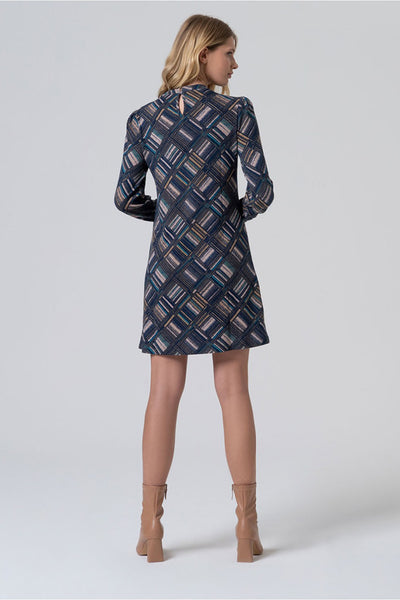 Vestido corto de silueta recta con cuello cerrado y manga ligeramente abullonada. El tejido elástico de poliéster reciclado y su suavidad lo hacen especialmente agradable de llevar. El print geométrico aporta un estilo fresco y contemporáneo.