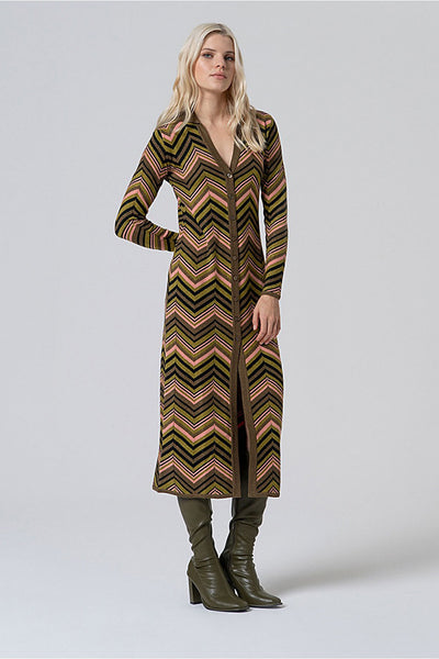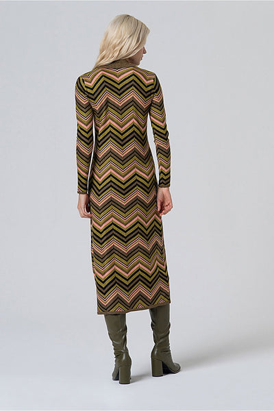 Vestido camisero de largo midi con cuello clásico y escote en pico pronunciado. Confeccionado en un tejido elástico con efecto brillante y estampado en zigzag, estiliza la silueta con un corte entallado y una botonadura frontal completa.